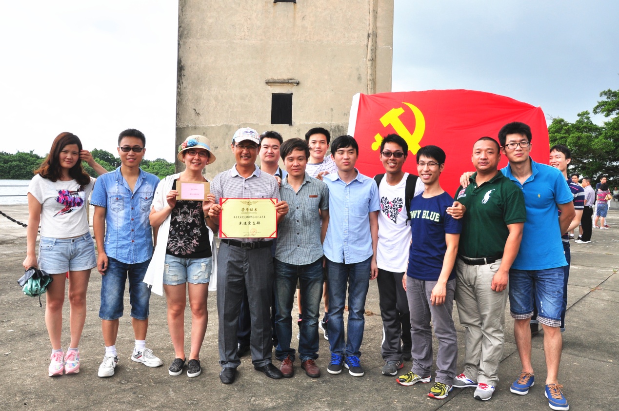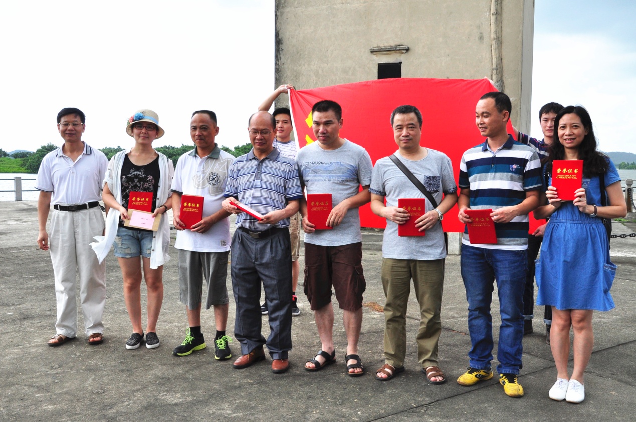 參觀當天,艷陽高照,在歡聲笑語的旅游車上,建黨紀念活動首先在熱烈的黨史知識有獎問答競賽拉開了帷幕。當答題告罄,獎品紛紛易主時,汽車就抵達開平南樓。該樓建于1921年,樓高七層19米,每層均有機槍和探照燈,是司徒氏人為防盜賊而建。抗戰(zhàn)時期,七名歸僑及僑屬青年曾在此堅守八天九夜痛擊日軍,最后彈盡糧絕,壯士全部捐軀。七壯士雕塑雄壯威武,英靈如塔,藍天之下,民族精神直沖云霄。我們就在當年這一浴血奮戰(zhàn)的所在默默地緬懷,莊重地對獲得2015年度先進黨支部和優(yōu)秀黨員進行表彰,展開鮮艷的黨旗合影……過程中,我們幾乎聽到烈士群像的呼吸。