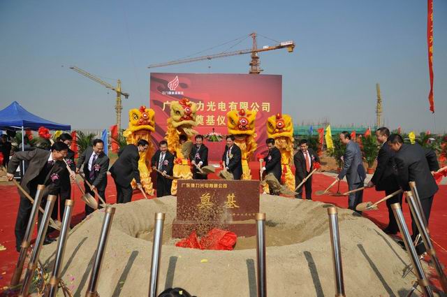 奠基儀式由高新區(qū)管委會副主任費偉東先生主持,甘化股份董事長兼總裁麥慶華先生和江門市政協(xié)副主席譚繼祖先生分別在會上致辭。最后,在轟鳴的禮炮聲中,各位領(lǐng)導(dǎo)為廣東德力光電有限公司外延片、芯片生產(chǎn)項目埋下了奠基石,奠基儀式在一片祝福聲中圓滿結(jié)束。