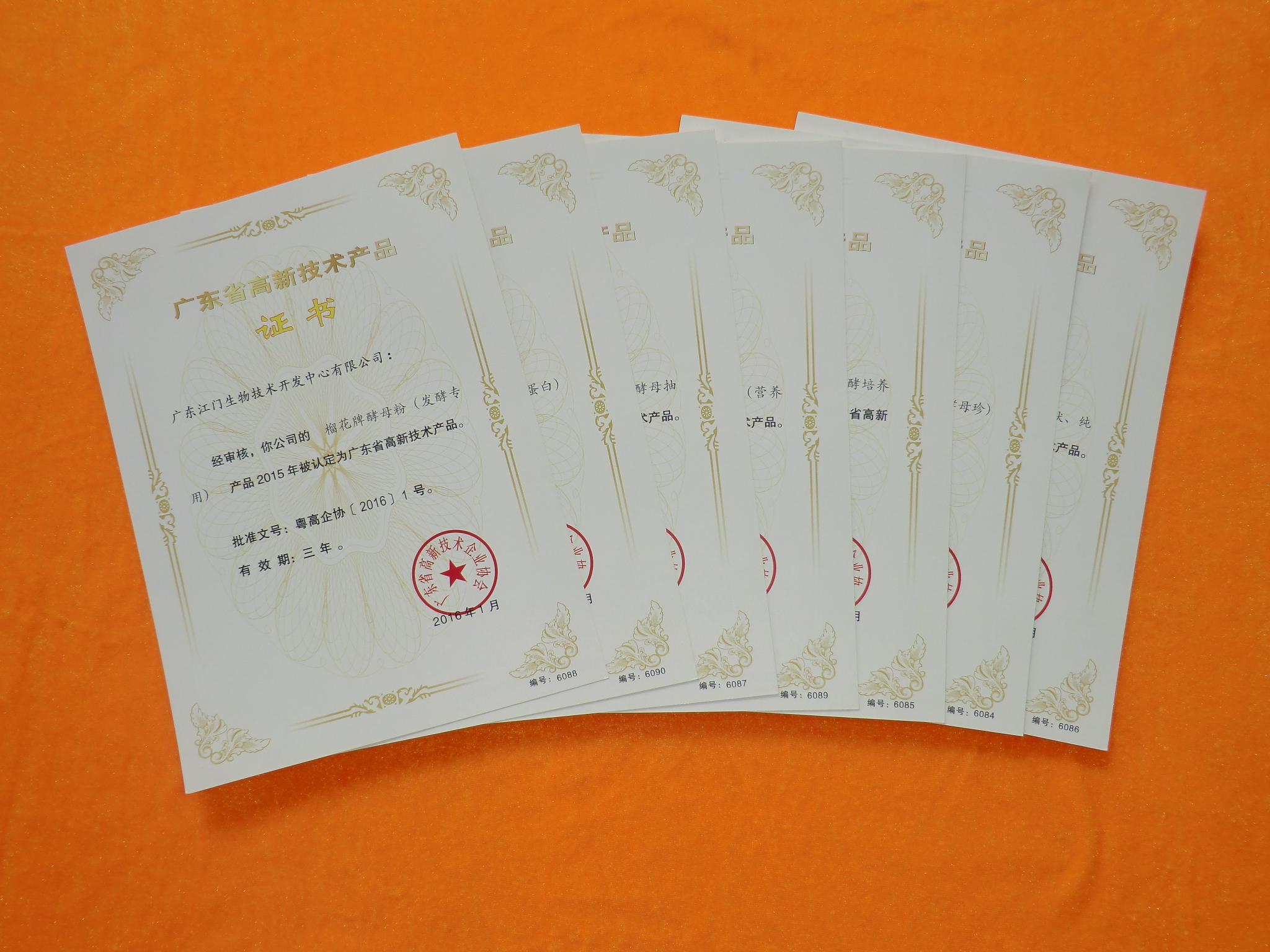 2016年1月份,生物中心的食用酵母、榴花牌酵母粉、酵母抽提物、酵母精粉、破壁型食用酵母、風(fēng)味復(fù)合酵母、甘蔗糖蜜酵母發(fā)酵培養(yǎng)物共7項(xiàng)產(chǎn)品通過(guò)省科技廳嚴(yán)格審核,獲認(rèn)定為2015年“廣東省高新技術(shù)產(chǎn)品”并取得證書。